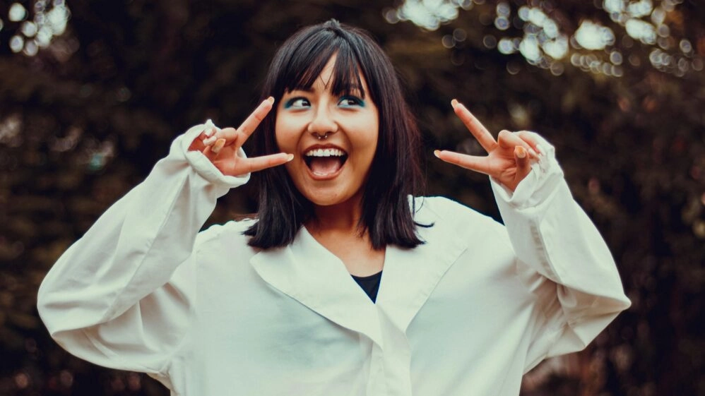 Chica contenta haciendo signo victoria
