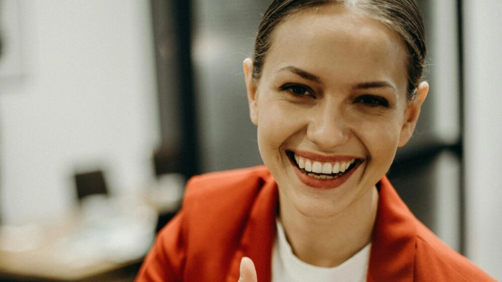 Mujer joven sonriendo y haciendo un gesto de aprobación con el pulgar, imagen que refleja el espíritu del playfulness y el bienestar ligero